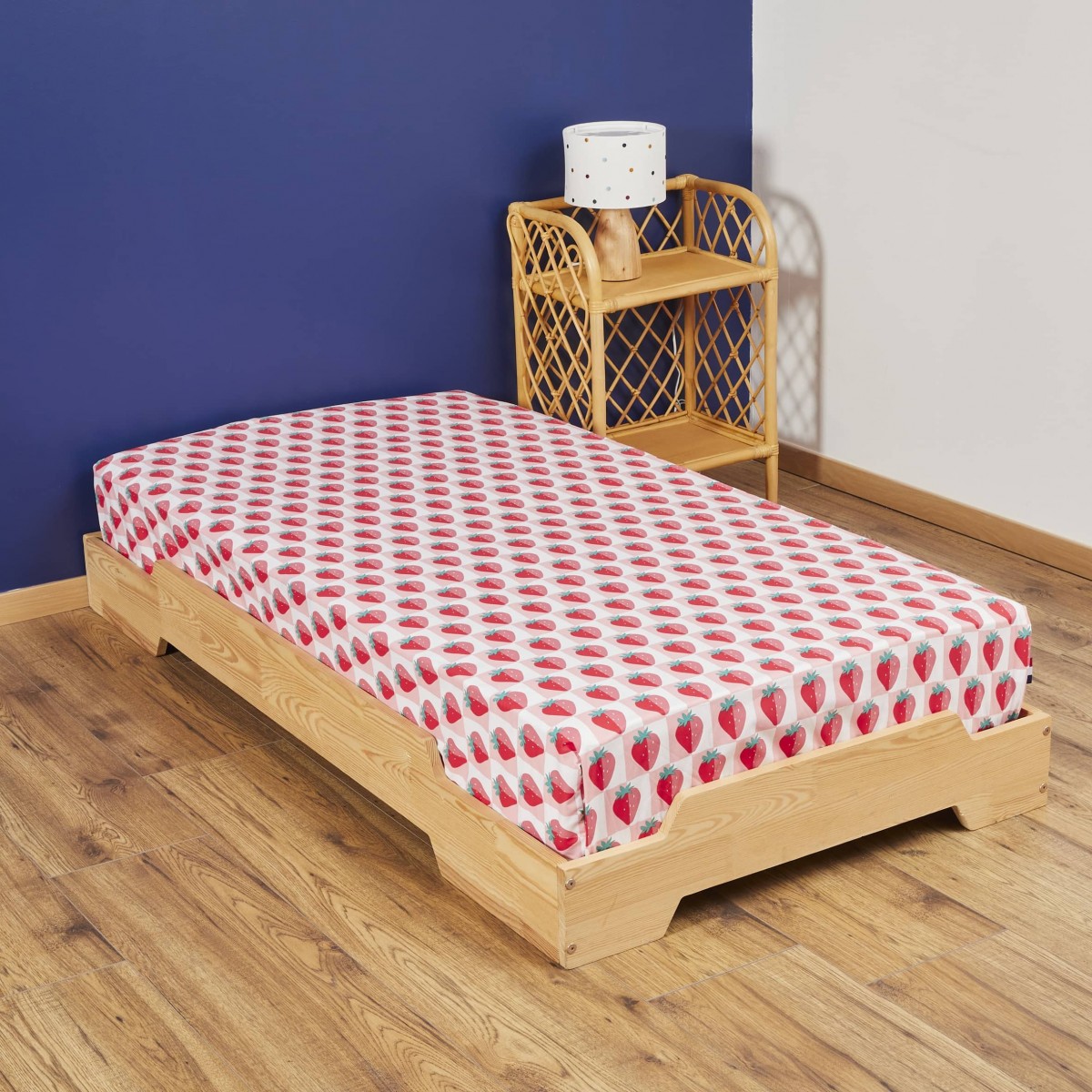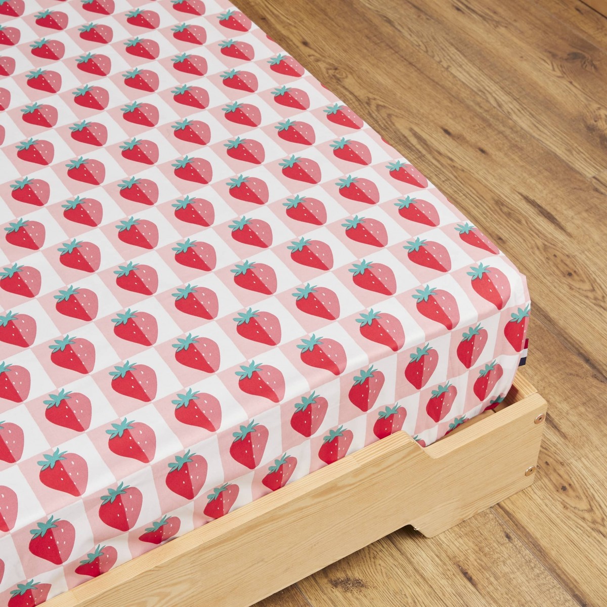 Le drap housse Fraises est en coton 100 % : il associe douceur, confort et maintien sur le matelas;