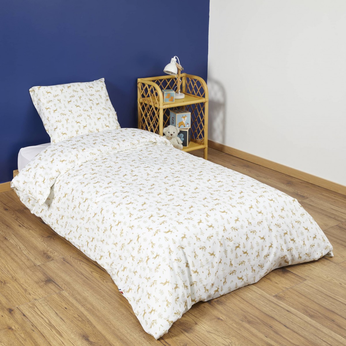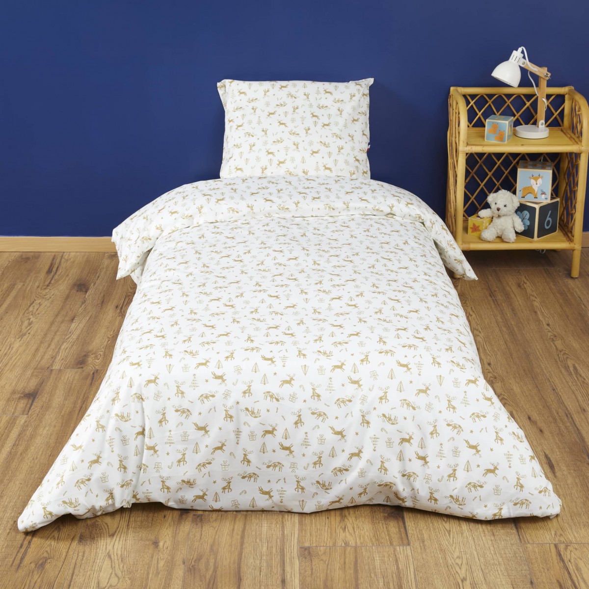 Apportez une touche de fantaisie à la chambre de votre enfant grâce à la parure Noël Rennes Dorés ! La parure de lit est en coton issu de l’agriculture biologique.